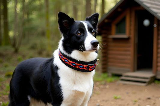 Schickes Hundehalsband Extra-Breit und Weich mit Neopren-Polster (Schwarz-Bunt auf Blau)